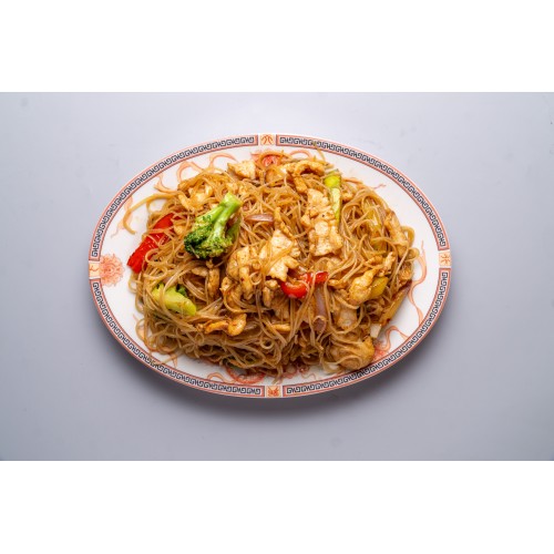 Fideos, pollo, zanahorias, cebolla, pimientos verde, calabacín, puerro, salsa soja y sal. Cocinado al Wok.